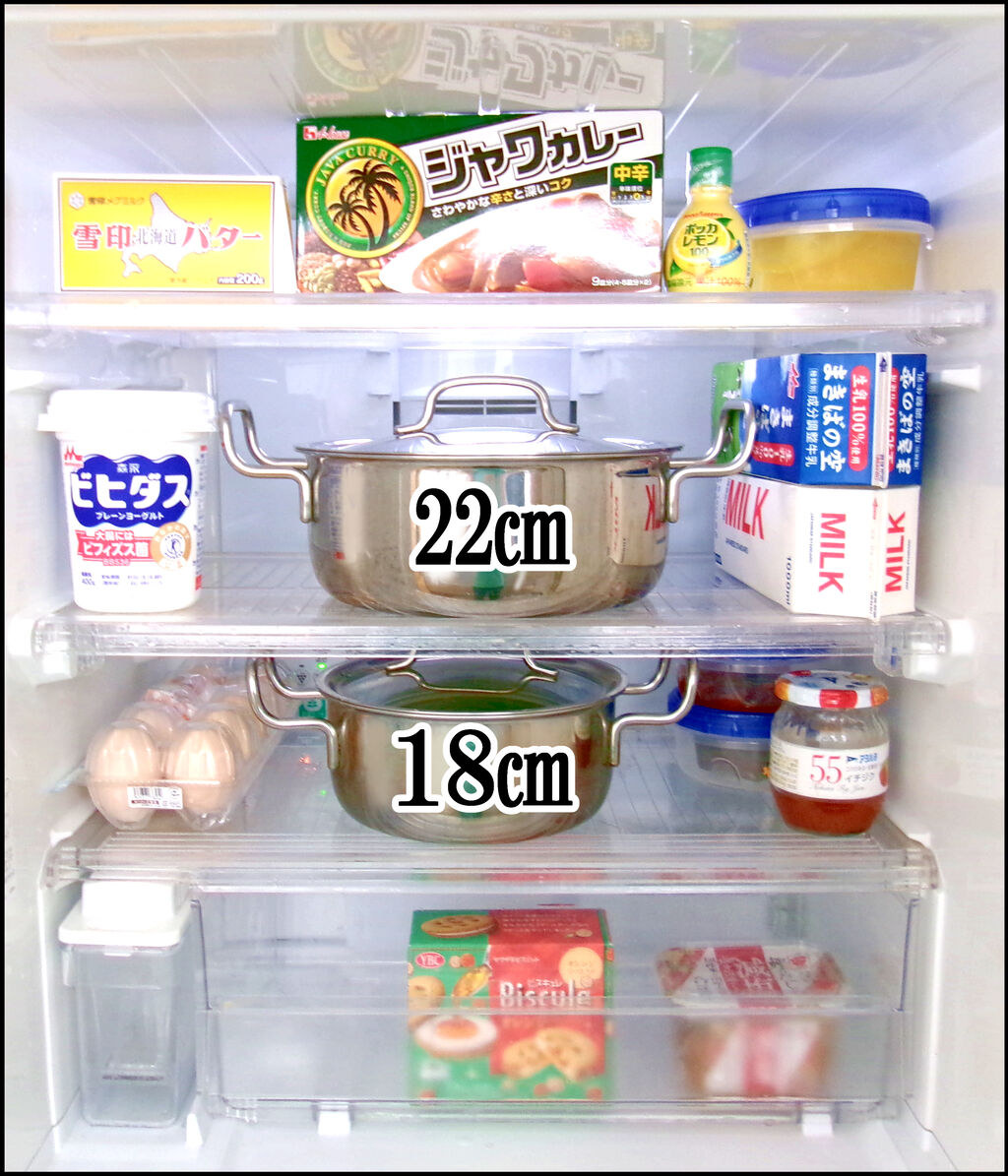 60cm幅の冷蔵庫です。上が22cm両手鍋。